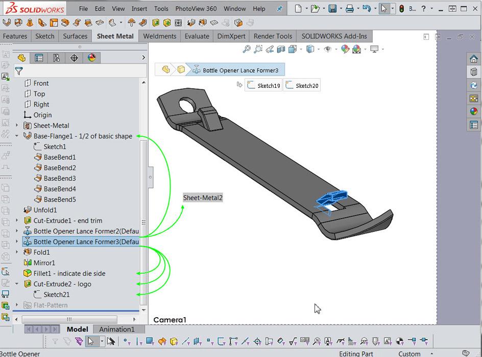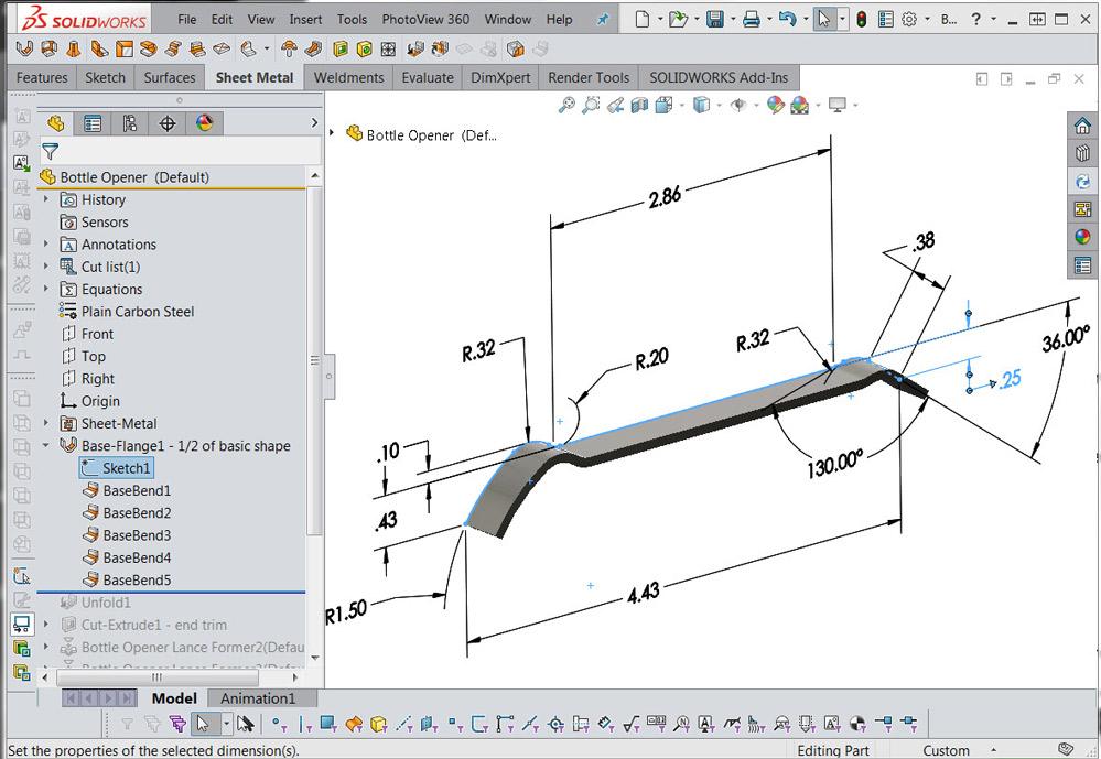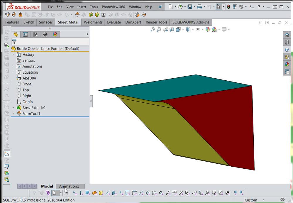 Theo các quy tắc của CAD, trình tự của mô hình hóa quan trọng. Trình tự Mặt bích cơ sở> Mở rộng> Lưỡi thương> Gấp cho phép các cây thương tồn tại trước khi cơ sở uốn cong. Nếu dụng cụ tạo hình được áp dụng cho đồ mở ở trạng thái bị uốn cong, lưỡi cắt sẽ không cắt vào phần uốn liền kề.