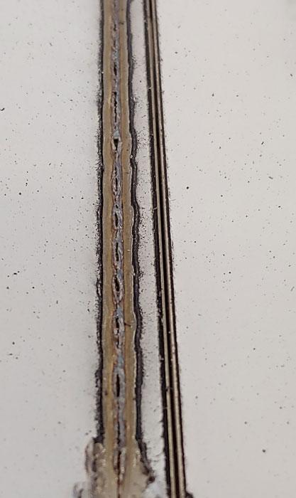 Hình 2 Chất lượng vết cắt có thể giảm mạnh khi các bộ phận được lồng quá gần nhau mà không có tab phù hợp, do phần lưới hẹp di chuyển và biến dạng trong quá trình cắt.