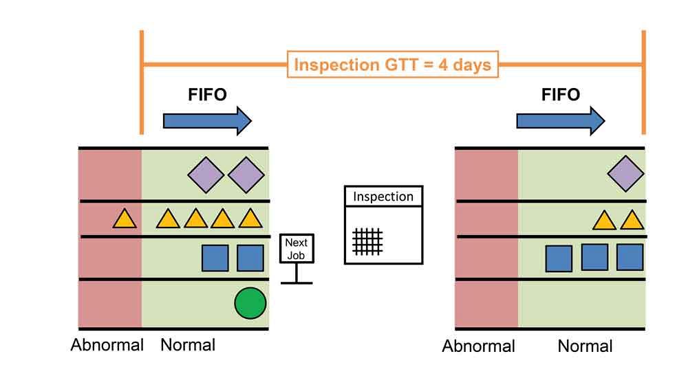 Kết quả của tất cả những nỗ lực này là việc tạo ra thời gian quay vòng được đảm bảo (GTT) thông qua quy trình chất lượng trung tâm, là thời gian được thiết kế để các bộ phận đạt chất lượng miễn là chúng đã được nhận vào một thời điểm nhất định. GTT được tính toán theo phương pháp toán học bằng cách sử dụng khái niệm khoảng thời gian (hoặc khoảng thời gian cần thiết để quay vòng qua các số bộ phận trong một họ sản phẩm) trong sản xuất theo mô hình hỗn hợp. Thiết kế GTT với cách tiếp cận toán học giúp loại bỏ nhu cầu về sự can thiệp của ưu tiên, xúc tiến, lập lịch trình và quản lý.