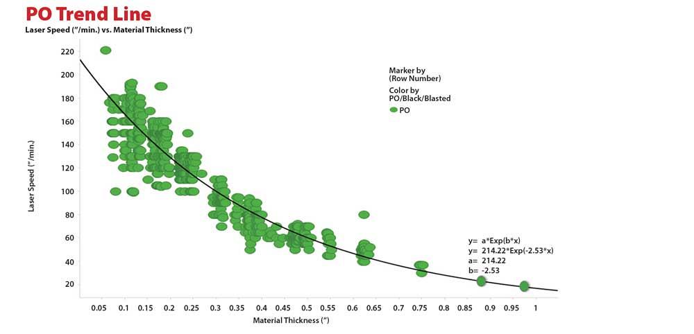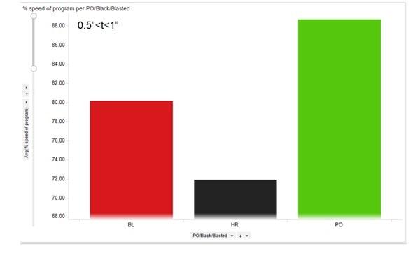 Các loại và độ dày khác nhau, từ 0,05 đến 1 inch, đã được cắt bằng hơn 1.500 lần chạy sản xuất. Vật liệu thổi có cửa sổ tốc độ cắt hẹp nhất, trong khi HRP&O cung cấp cửa sổ rộng nhất. Dữ liệu cũng cho thấy có thể đạt được tốc độ cắt cao hơn khi sử dụng HRP&O.