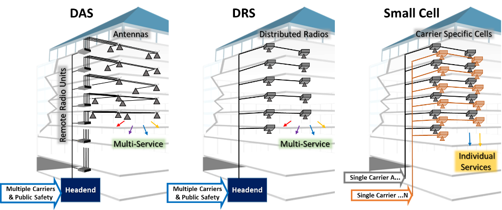 - Hệ thống vô tuyến phân tán (DRS) có nhiều điểm truy cập vô tuyến với một hoặc nhiều MNO nằm trên toàn bộ cơ sở, thường thích hợp cho các tòa nhà cỡ vừa và các địa điểm sản xuất.